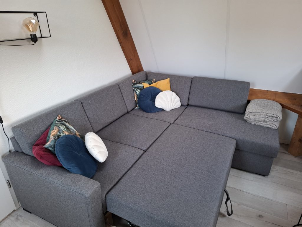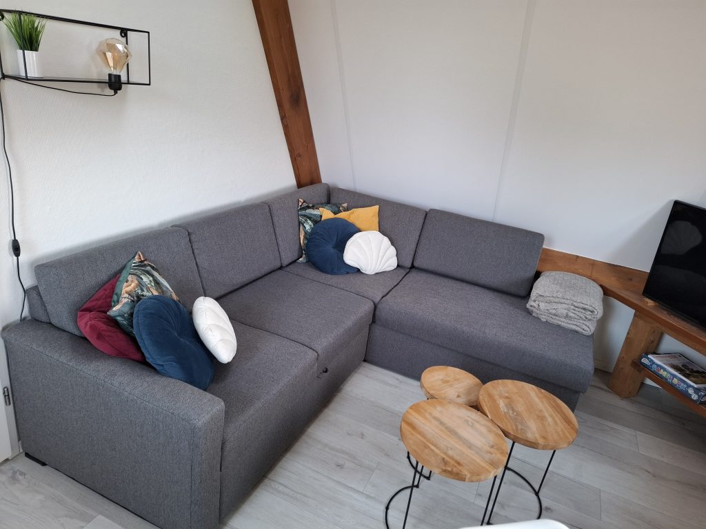 De woonkamer is voorzien van een hoekbank, 4K smart TV, waterkoker, sap pers, Dolce Gusto, koffiezetapparaat, eettafel met 4 stoelen en gratis WIFI.